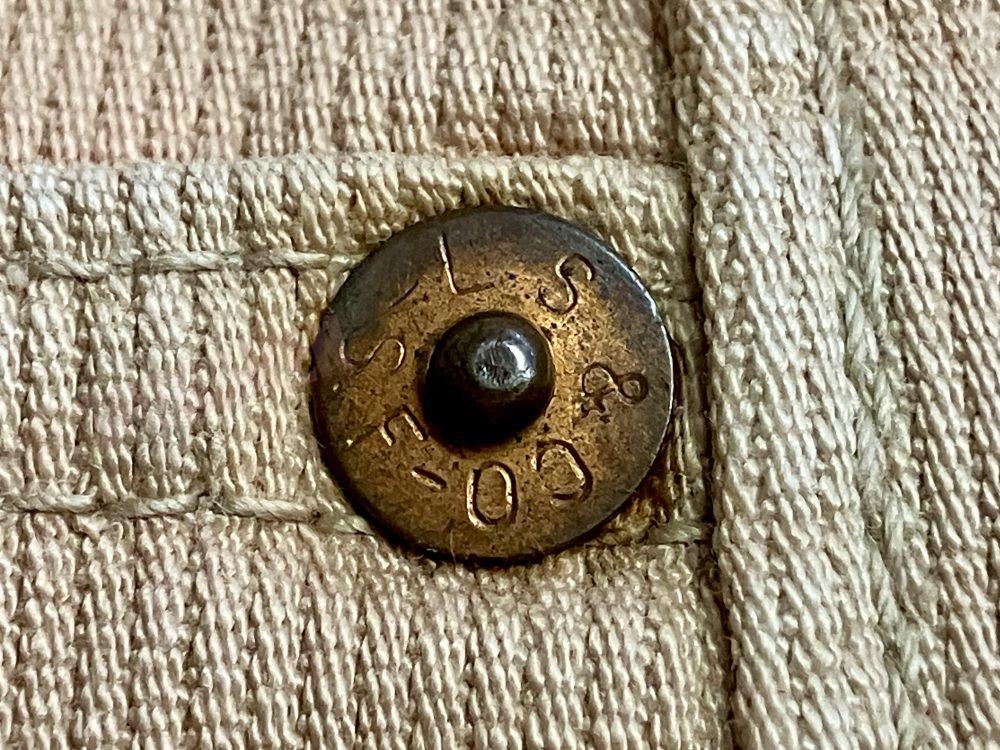 ちなみに冒頭の写真の「V」刻印は、ピケ素材の5ポケットパンツのトップボタン裏に存在しています。