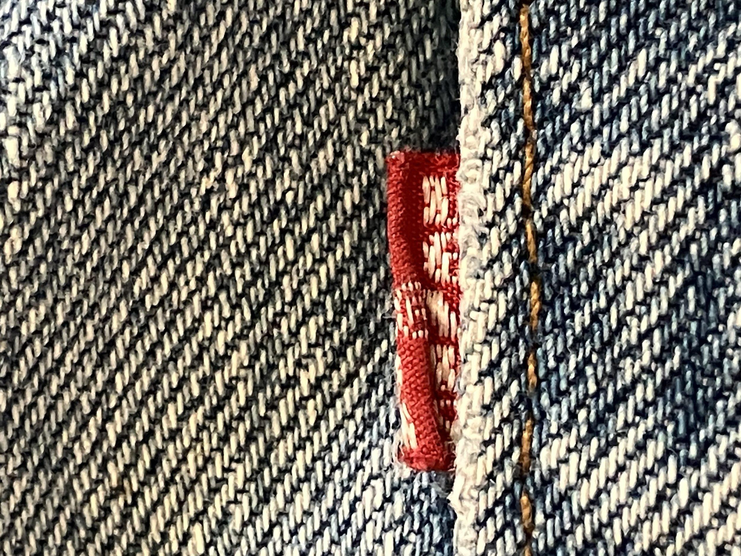 バックポケットのカンヌキは橙色糸で表から仕込まれ、赤タブは丸まっていてこれも佳き。