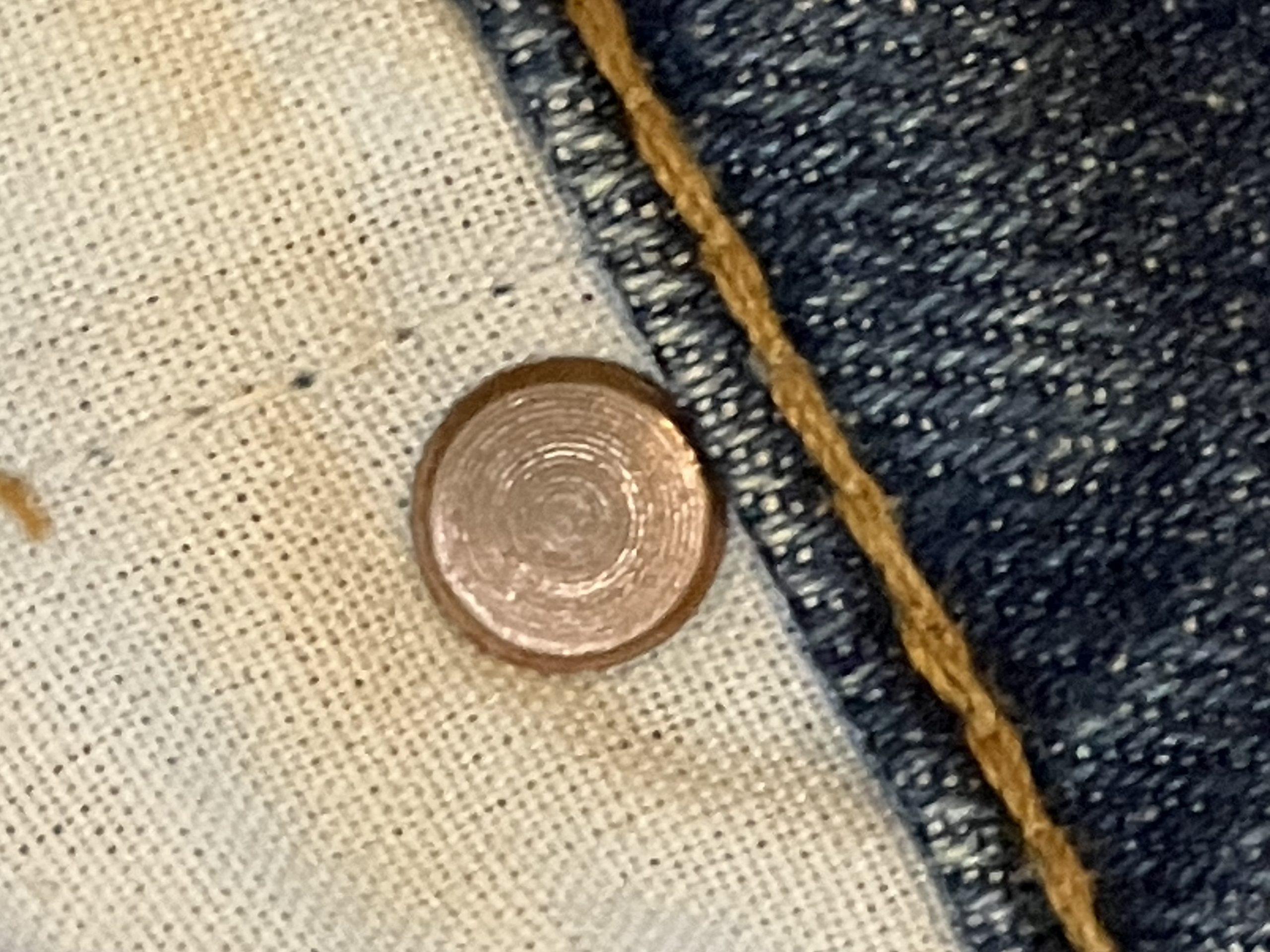トップボタンは銅色、リベット裏は銅色でロゴ無し。